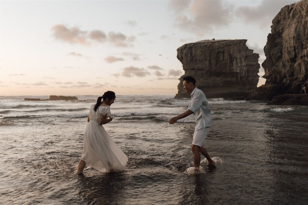 Muriwai Beach in Auckland at sunset is one of the most stunning stretches of coastline in New Zealand. Anna and Lee, who had shared so many memories here, chose to celebrate their love in a place that meant so much to them. They danced and splashed in the waves, their playful energy and laughter carrying across the rugged coastline. This sunset couple shoot perfectly captured the fun loving connection they share.